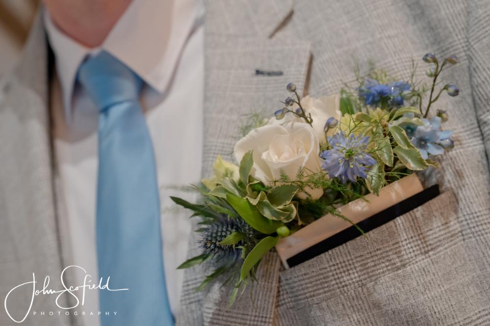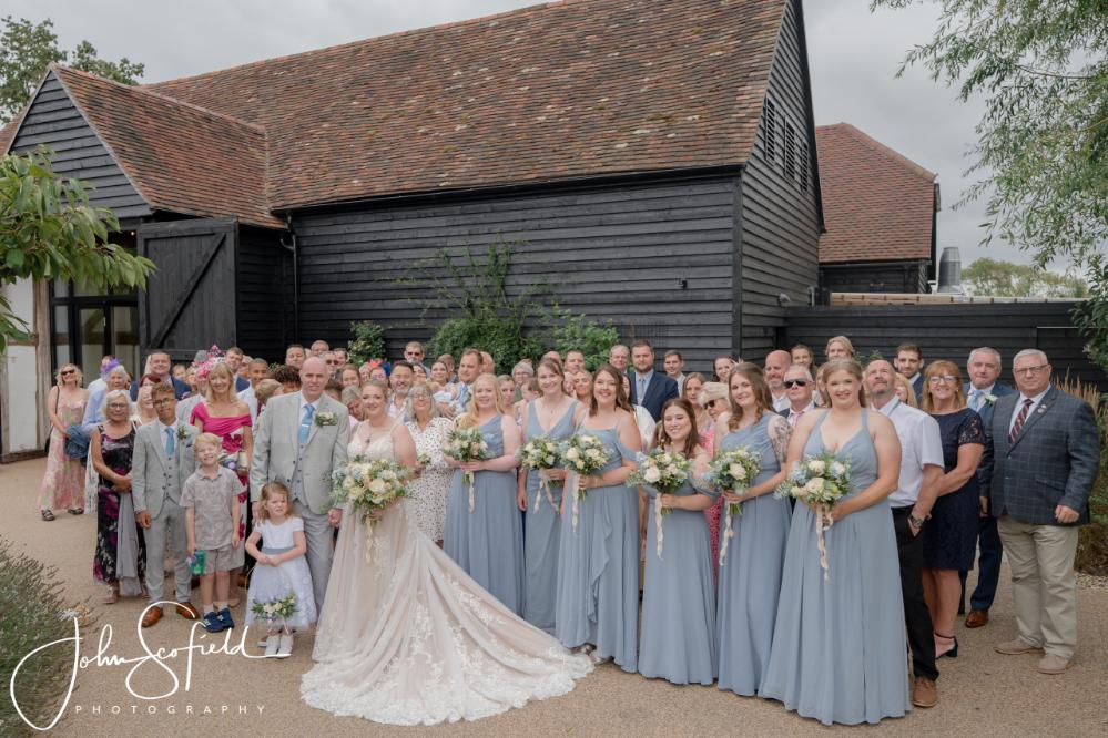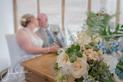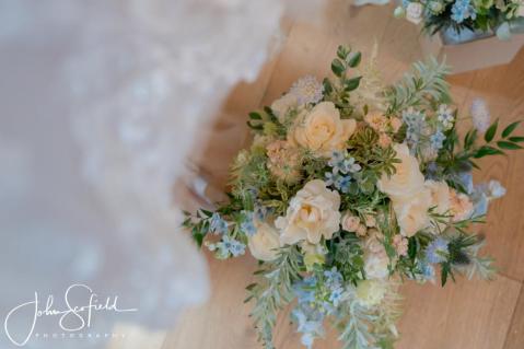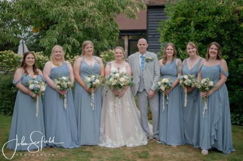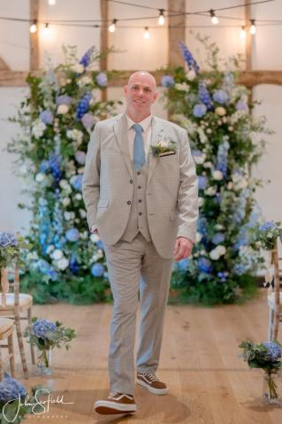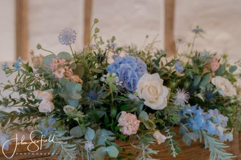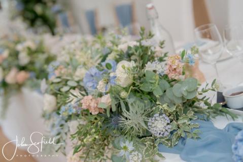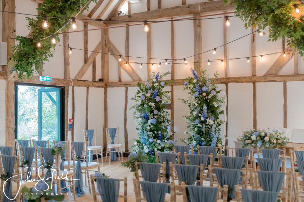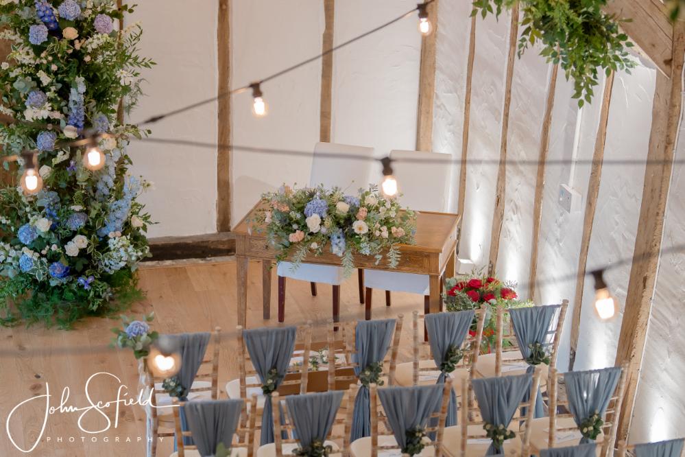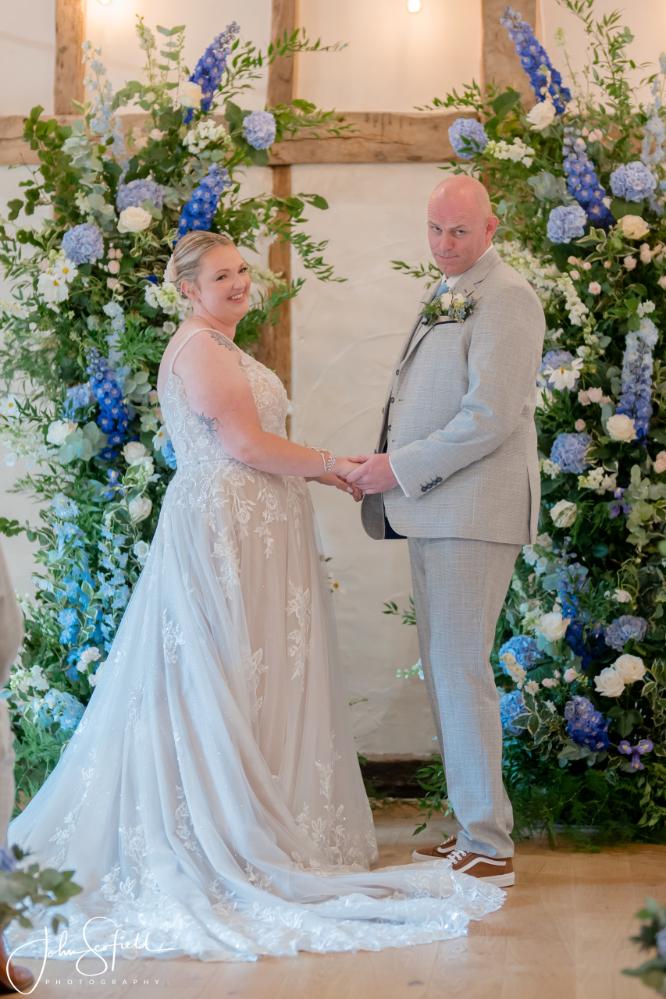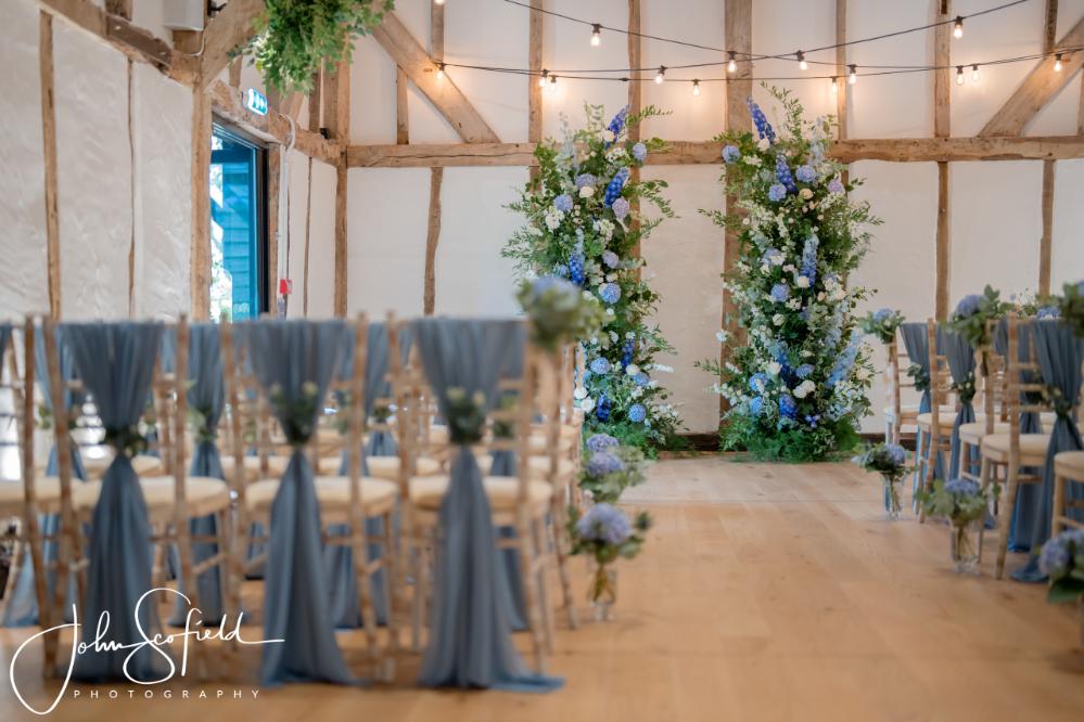 Their chosen palette—dusky blue, soft champagne, and gentle garden greens—came to life through loose, natural bouquets and a breathtaking broken arch that framed the aisle. Hydrangeas, delphiniums, and roses cascaded through the design, echoing the powder‑blue hydrangeas that lined the walkway. A celebration filled with texture, movement, and the quiet magic of an English summer’s day.