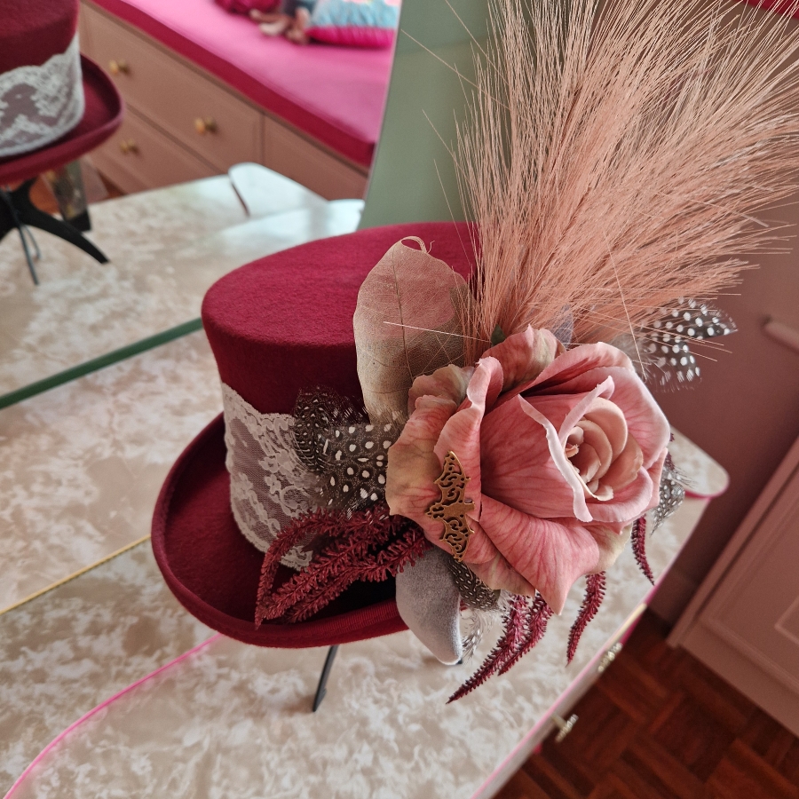 Command attention with this deep burgundy top hat, handcrafted from 100% premium hardened wool for a structured, elegant silhouette. Designed for those who embrace drama and detail, it features a detachable arrangement of handmade faux flowers—allowing you to shift from romantic flourish to minimalist edge with ease.