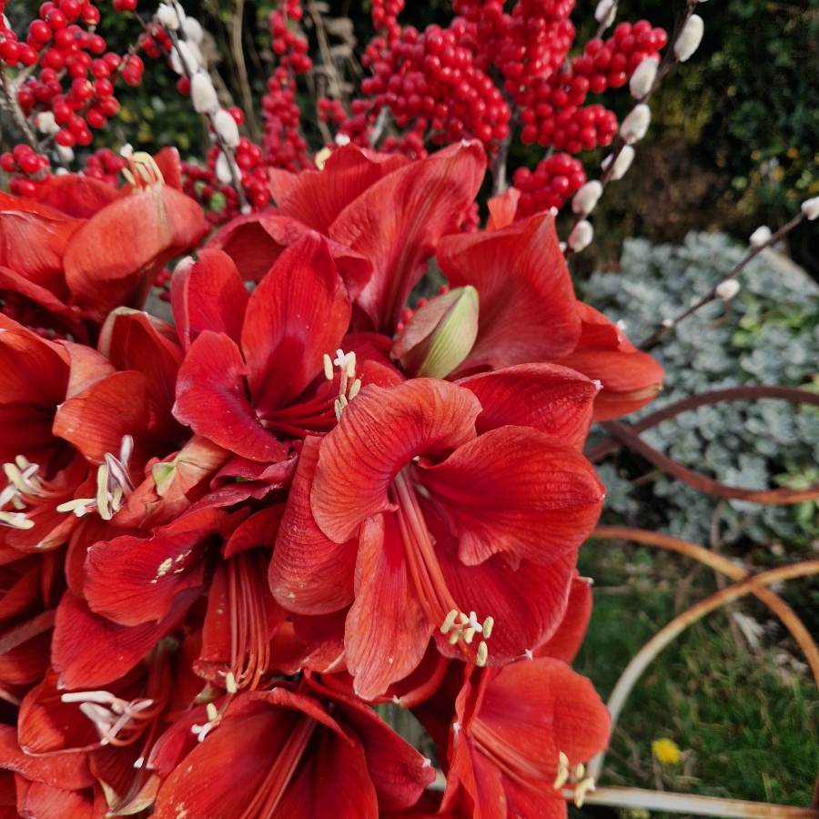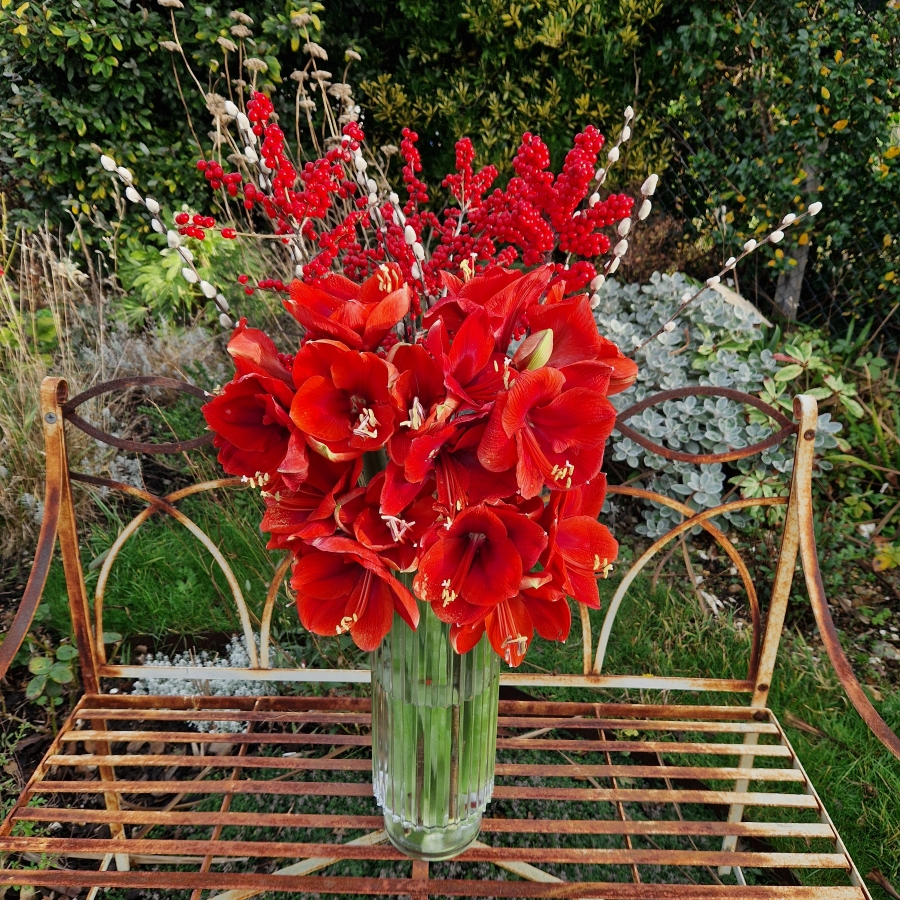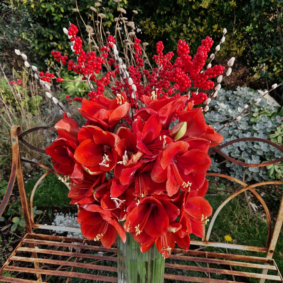 A bold and elegant celebration of the season. This striking vase arrangement features rich red amaryllis, vibrant ilex berries, and sculptural pussy willow, creating a festive silhouette full of texture and warmth. Perfect for gifting or adding a touch of drama to your Christmas table or hallway.