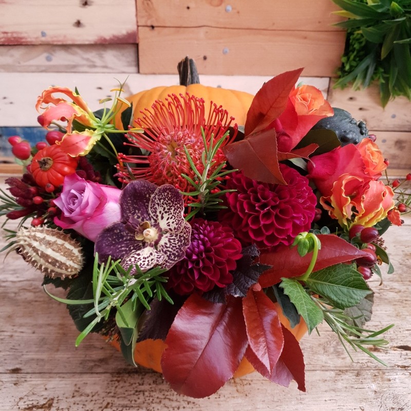 A fresh pumpkin brimming with seasonal flowers in warm, autumnal tones. Think velvety textures, rich colours, and a little Halloween mischief.
